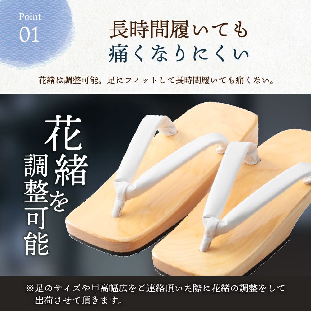 | 使用上の注意 | 1.下駄は傷つきやすいので取り扱いは十分ご注意下さい。 2.濡れた場所ではスリップに注意してくだい。 3.水に濡れた場合、花緒が色落ちする恐れがあります。 4.塗下駄は、衝撃を与えると塗りが剥がれることがあります。 5.自然木の為、ヤニ(樹液)が出る場合がございます。 |