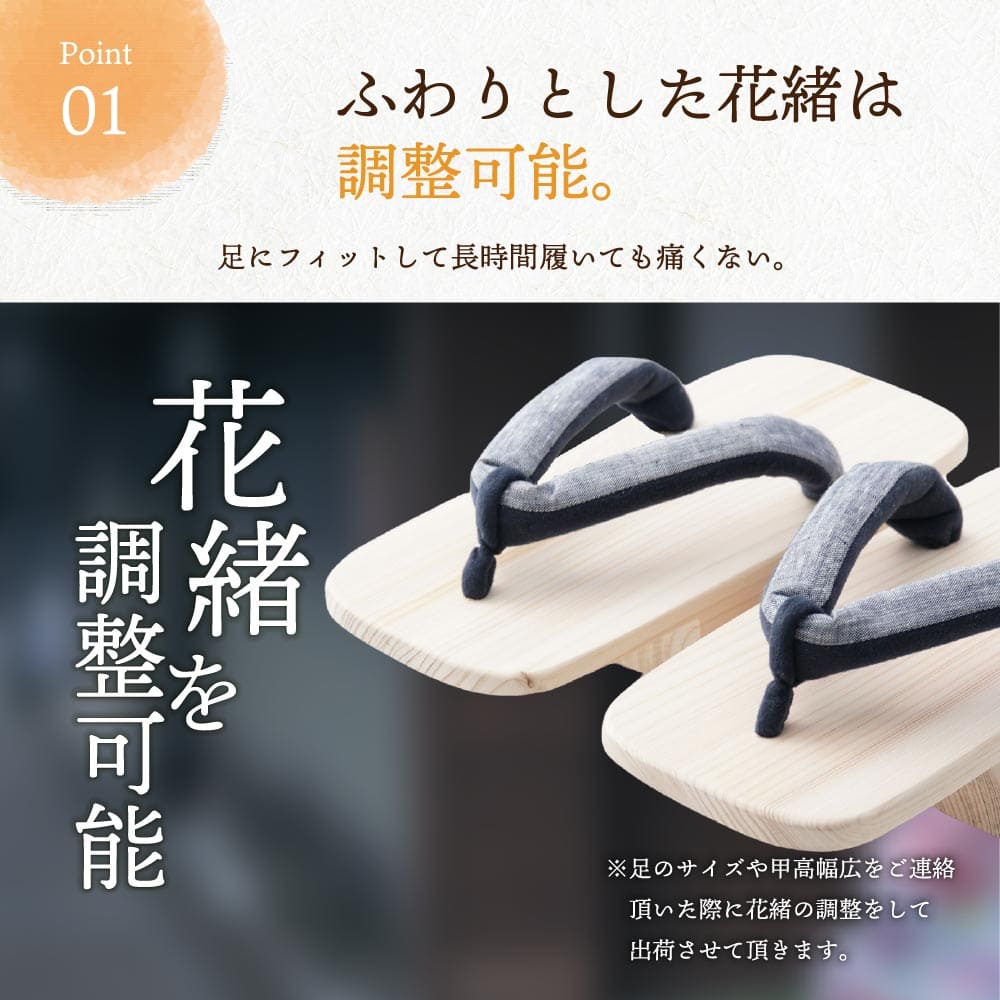| ※自然木を使用している為、写真とは木目が異なる場合がございます。 ※大きな生地を細く切って花緒に使用していますので、それぞれ柄の出具合が違っており写真とは見た目が異なることがあります。 ※デジタルカメラ、モニターの性能上、画像の明るさや色合いなどが、多少実物と異なる場合がございますが、ご了承下さい。 | |