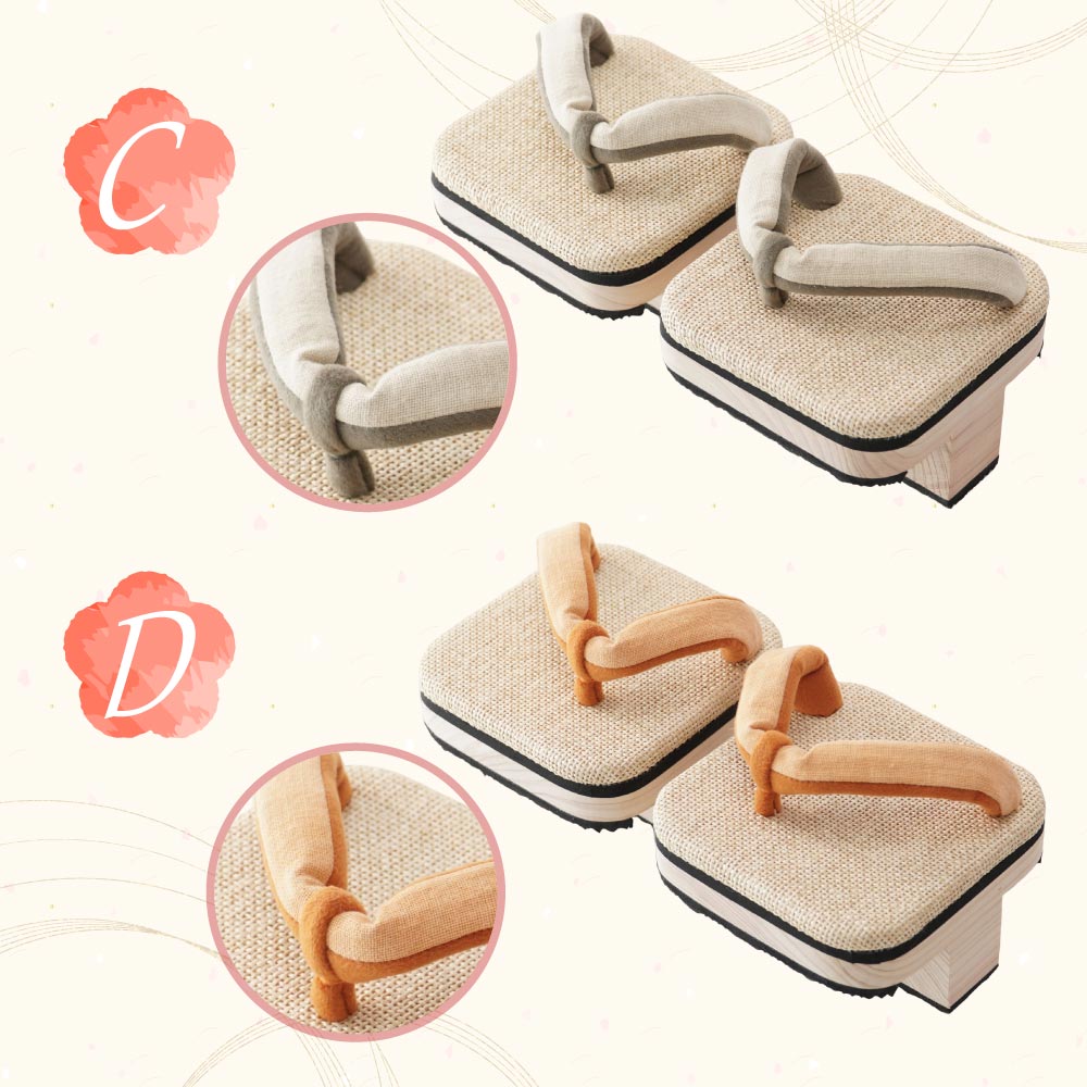 ※自然木を使用している為、写真とは木目や色目が異なる場合がございます。 ※大きな生地を細く切って花緒に使用していますので、それぞれ柄の出具合が違っており写真とは見た目が異なることがあります。 ※デジタルカメラ、モニターの性能上、画像の明るさや色合いなどが、多少実物と異なる場合がございますが、ご了承下さい。 | |