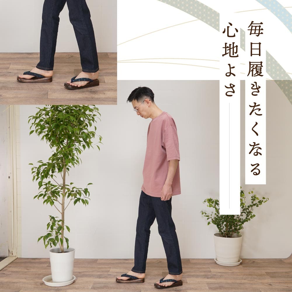 ※自然木を使用している為、写真とは木目や色目が異なる場合がございます。 ※大きな生地を細く切って花緒に使用していますので、それぞれ柄の出具合が違っており写真とは見た目が異なることがあります。 ※デジタルカメラ、モニターの性能上、画像の明るさや色合いなどが、多少実物と異なる場合がございますが、ご了承下さい。 | |