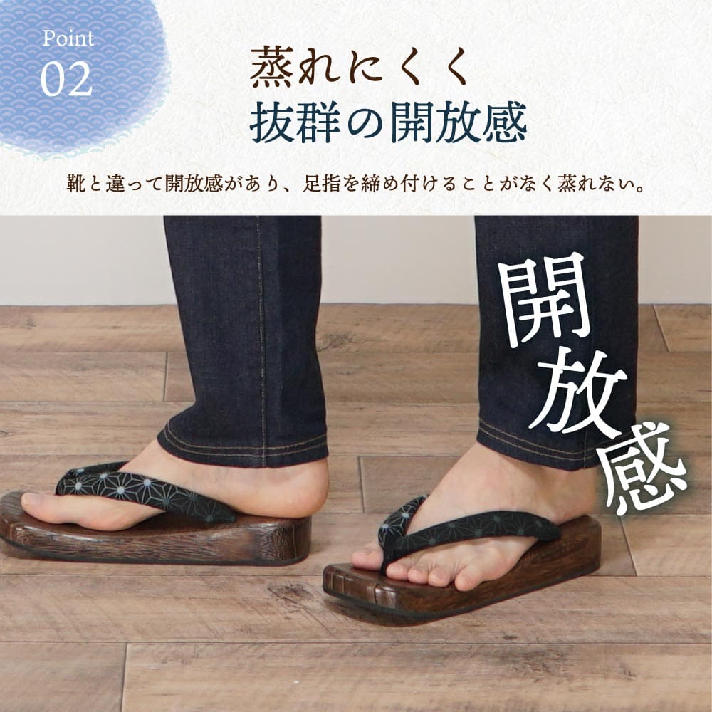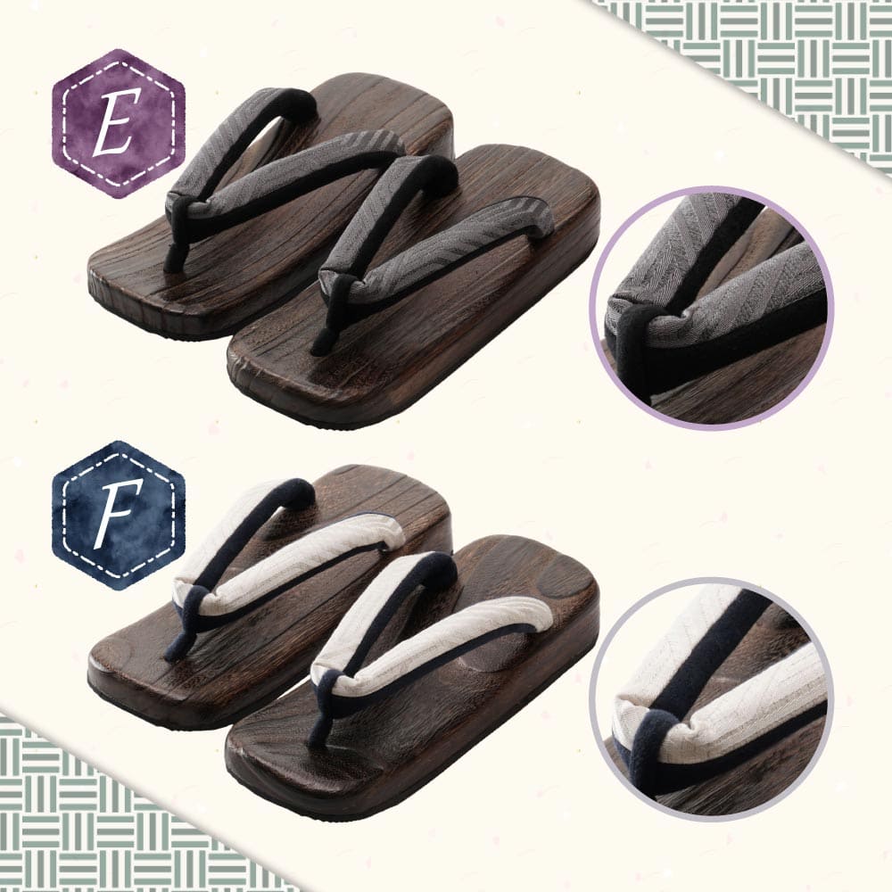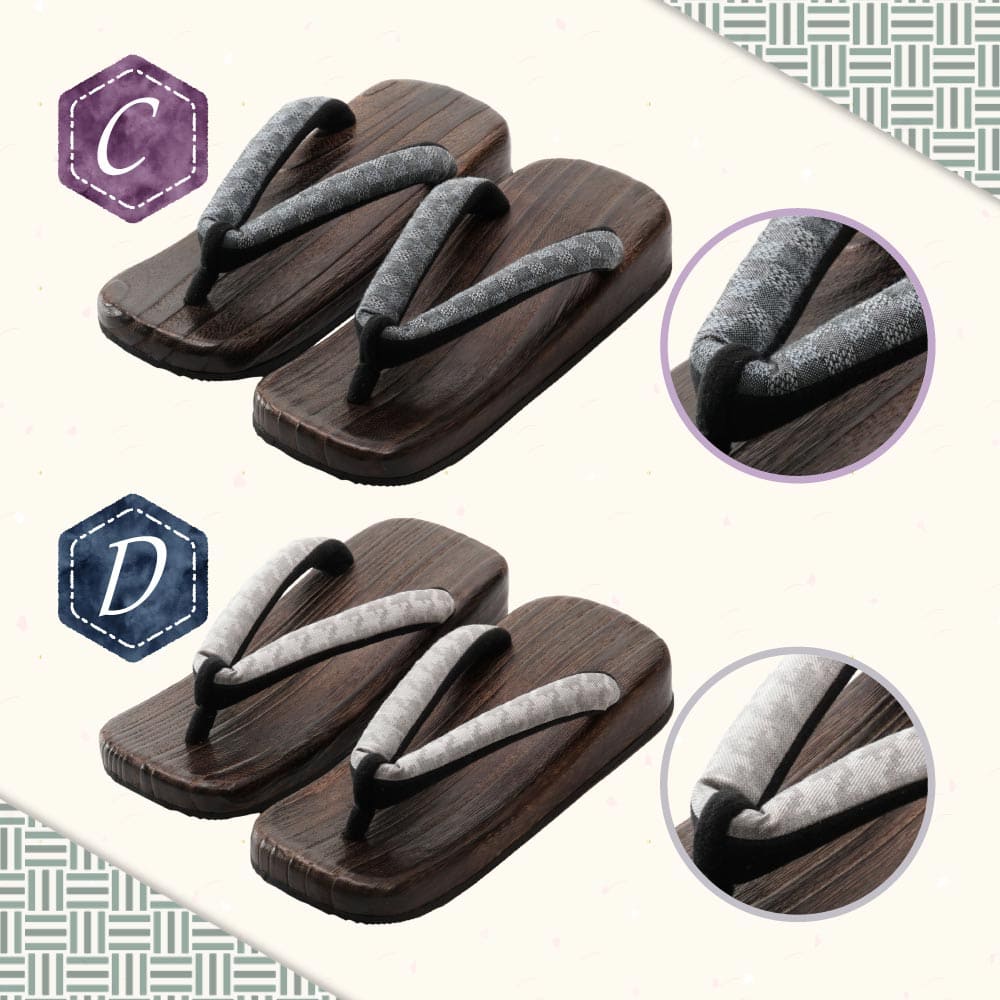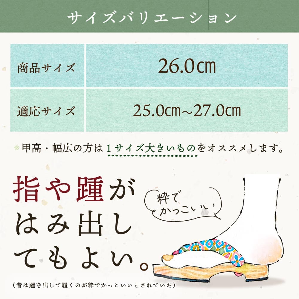 | 使用上の注意 | 1.下駄は傷つきやすいので取り扱いは十分ご注意下さい。 2.濡れた場所ではスリップに注意してくだい。 3.水に濡れた場合、花緒が破損、色落ちする恐れがあります。 4.焼下駄は、足の裏に色がつくことがあります。 |