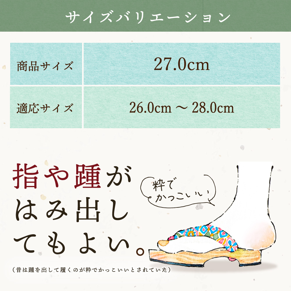 | 使用上の注意 | 1.下駄は傷つきやすいので取り扱いは十分ご注意下さい。 2.濡れた場所ではスリップに注意してくだい。 3.水に濡れた場合、花緒が破損、色落ちする恐れがあります。 |