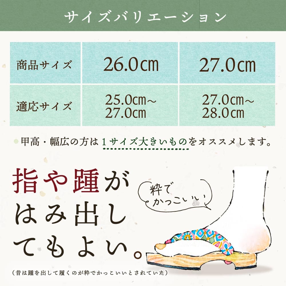 | 使用上の注意 | 1.下駄は傷つきやすいので取り扱いは十分ご注意下さい。 2.濡れた場所ではスリップに注意してくだい。 3.水に濡れた場合、花緒が破損、色落ちする恐れがあります。 4.白木下駄は、足の跡が付く事があります。 |