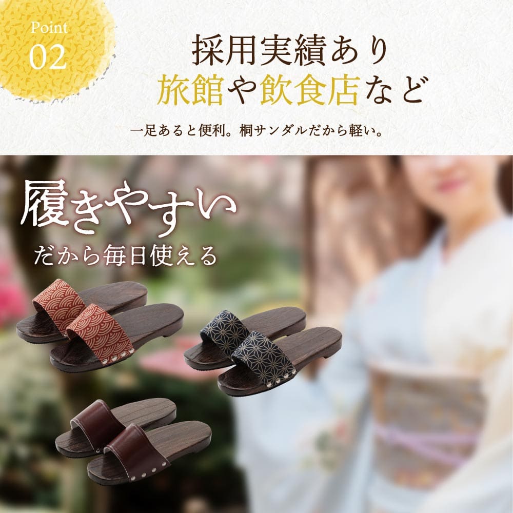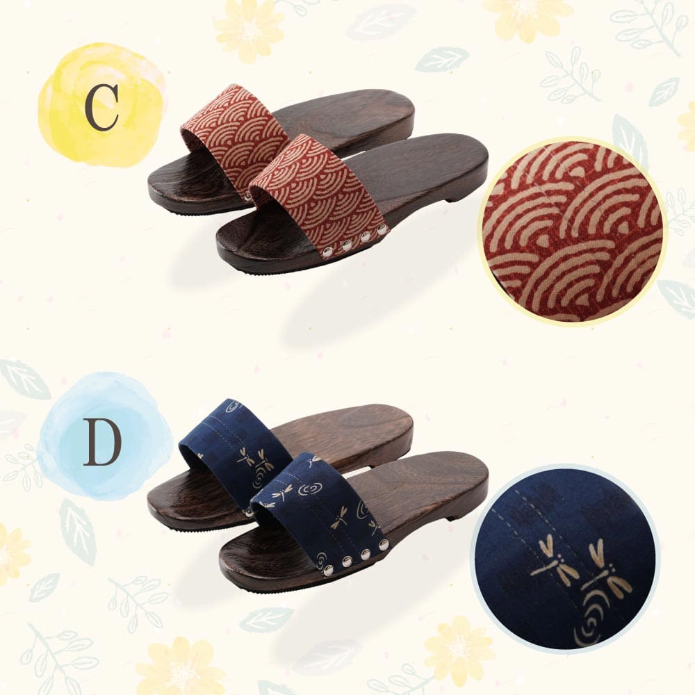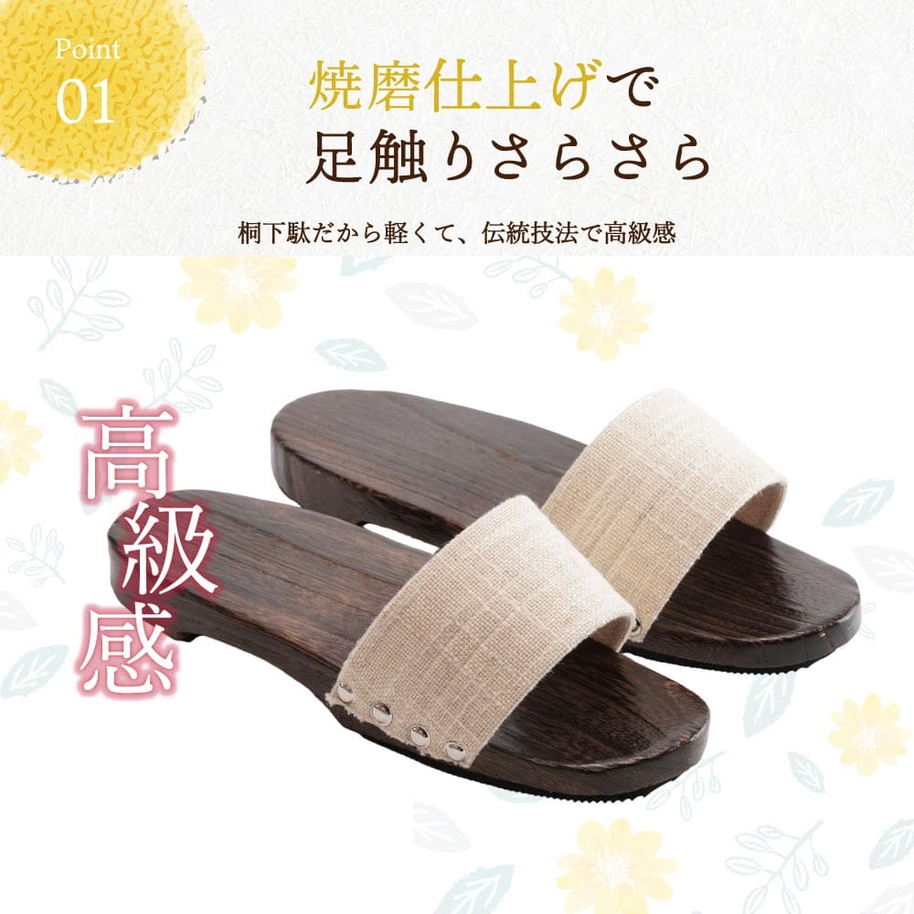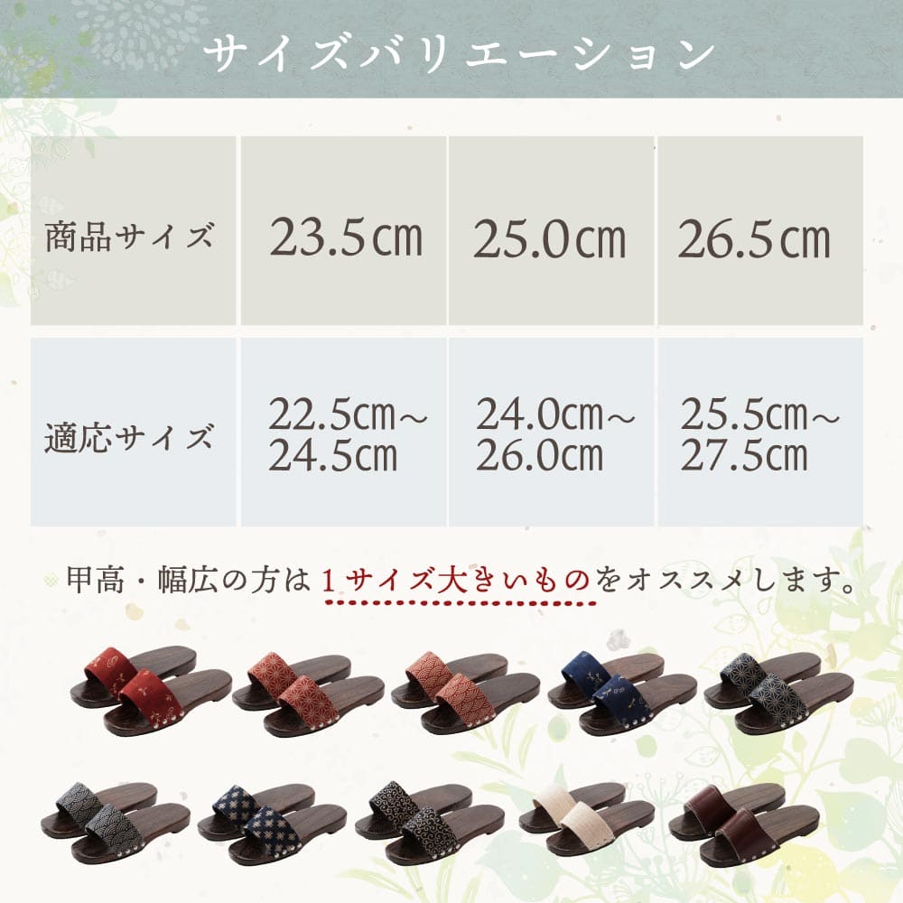 | 使用上の注意 | 1.木製サンダルは傷つきやすいので取り扱いは十分ご注意下さい。 2.濡れた場所ではスリップに注意してくだい。 3.水に濡れた場合、花緒が破損、色落ちする恐れがあります。 4.焼木製サンダルは、足の裏に色がつくことがあります。 |