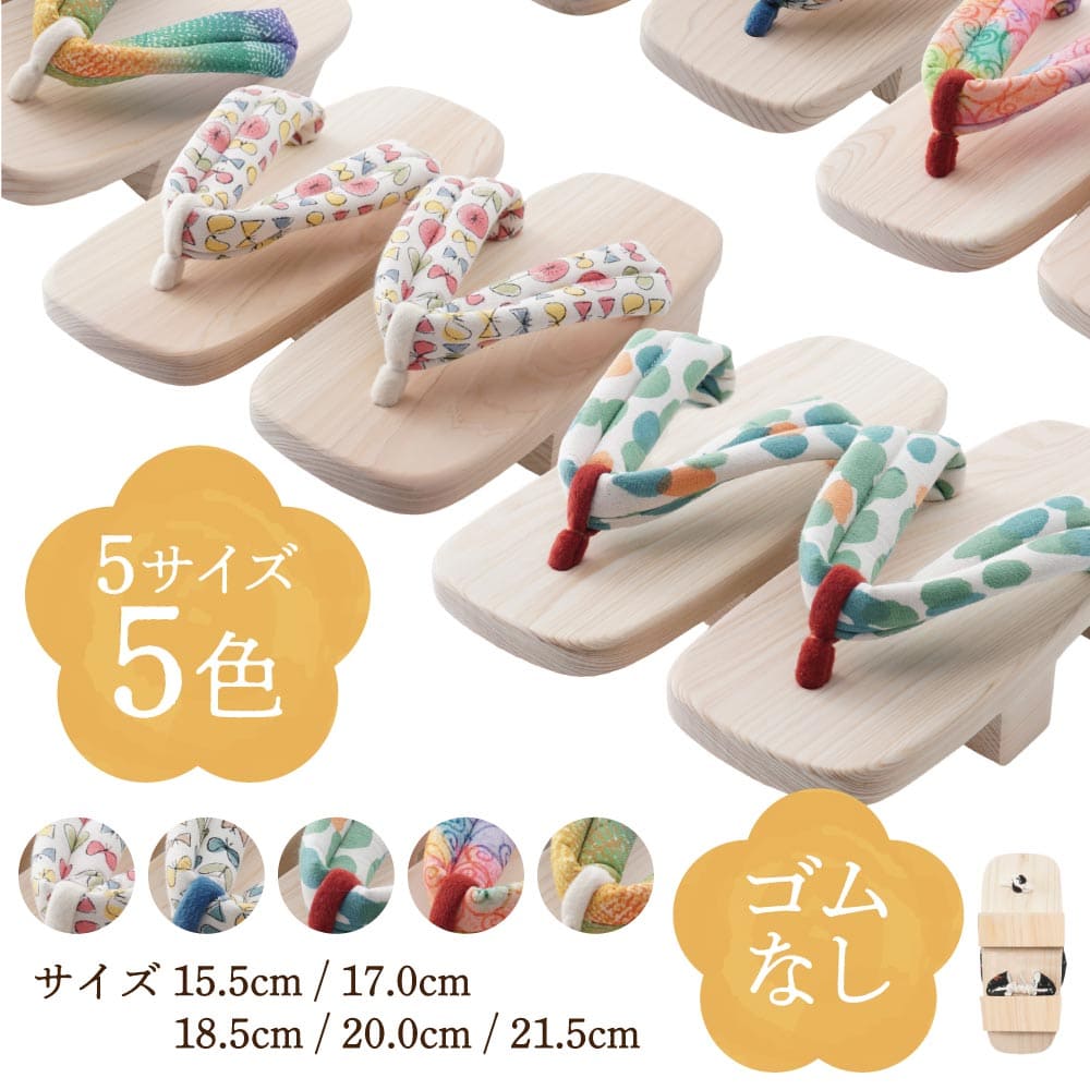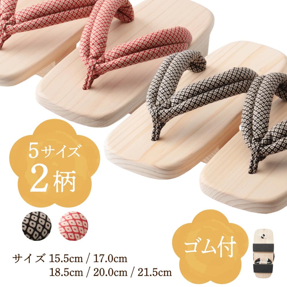 | ※自然木を使用している為、写真とは木目が異なる場合がございます。 ※大きな生地を細く切って花緒に使用していますので、それぞれ柄の出具合が違っており写真とは見た目が異なることがあります。 ※デジタルカメラ、モニターの性能上、画像の明るさや色合いなどが、多少実物と異なる場合がございますが、ご了承下さい。 | |