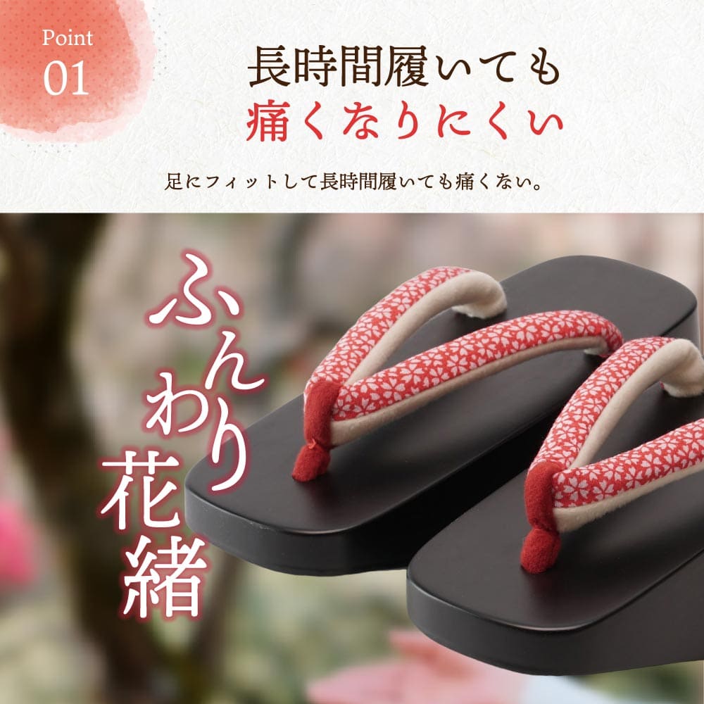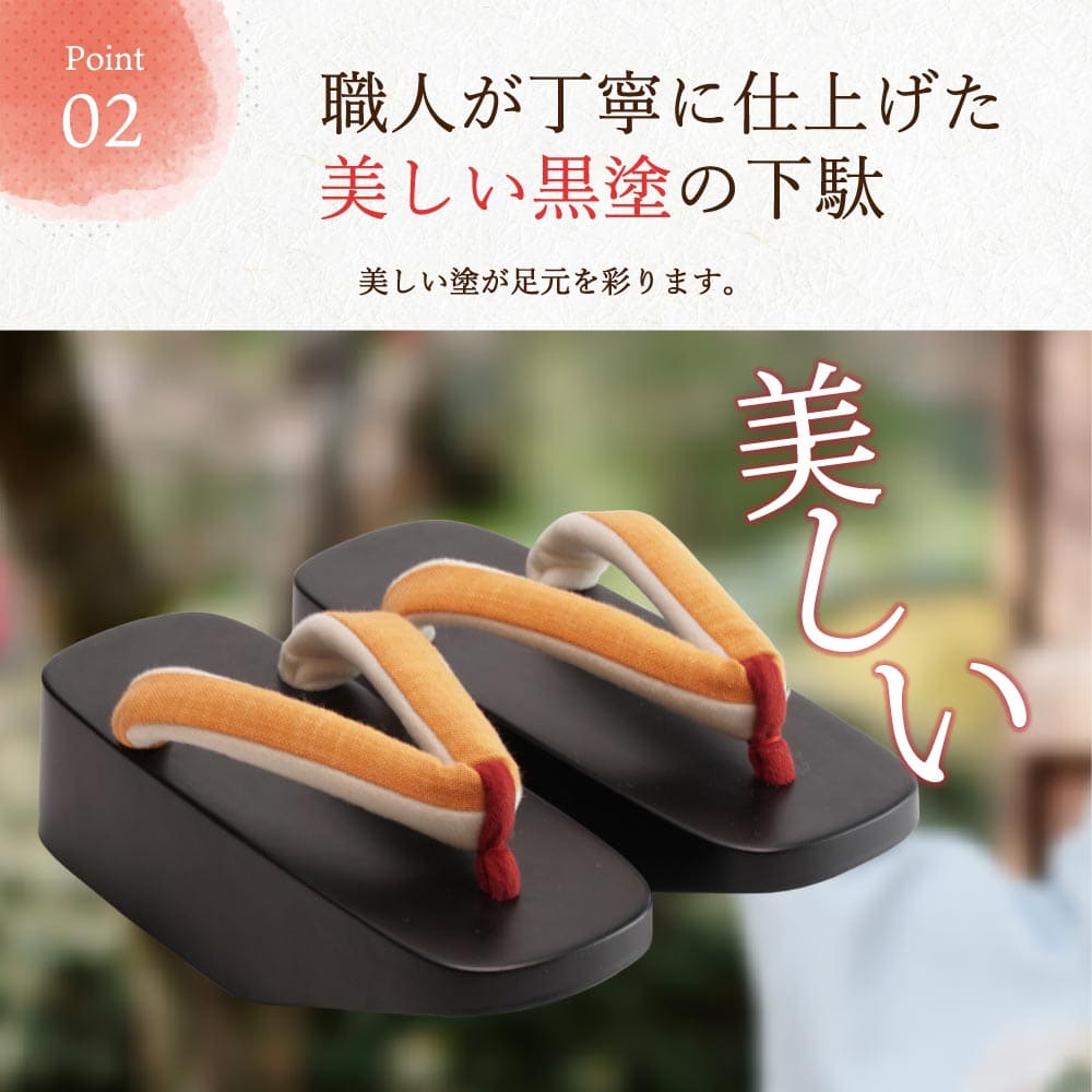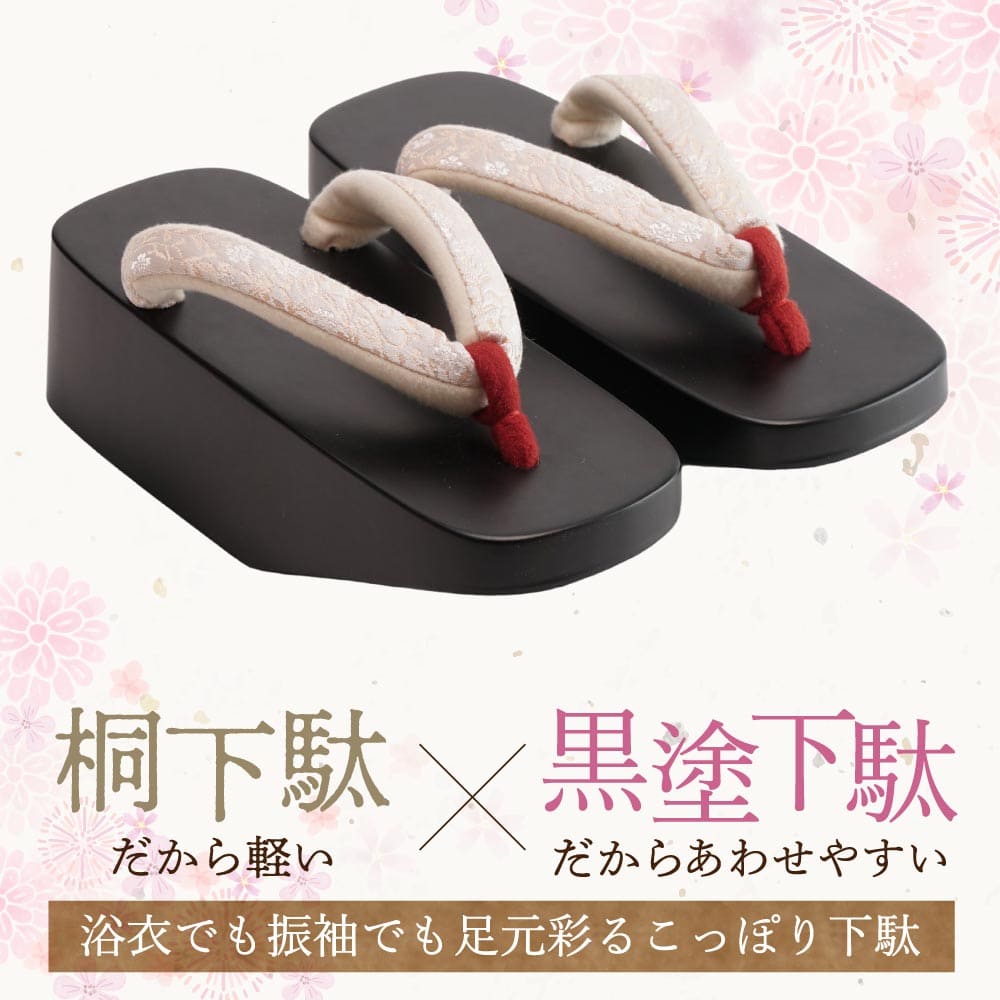 | 使用上の注意 | 1.下駄は傷つきやすいので取り扱いは十分ご注意下さい。 2.濡れた場所ではスリップに注意してくだい。 3.水に濡れた場合、花緒が破損、色落ちする恐れがあります。 4.裏金がついた商品は、裏金が取れる場合があります。 5.塗下駄は、衝撃を与えると塗りが剥げることがあります。 |