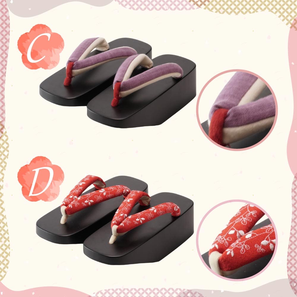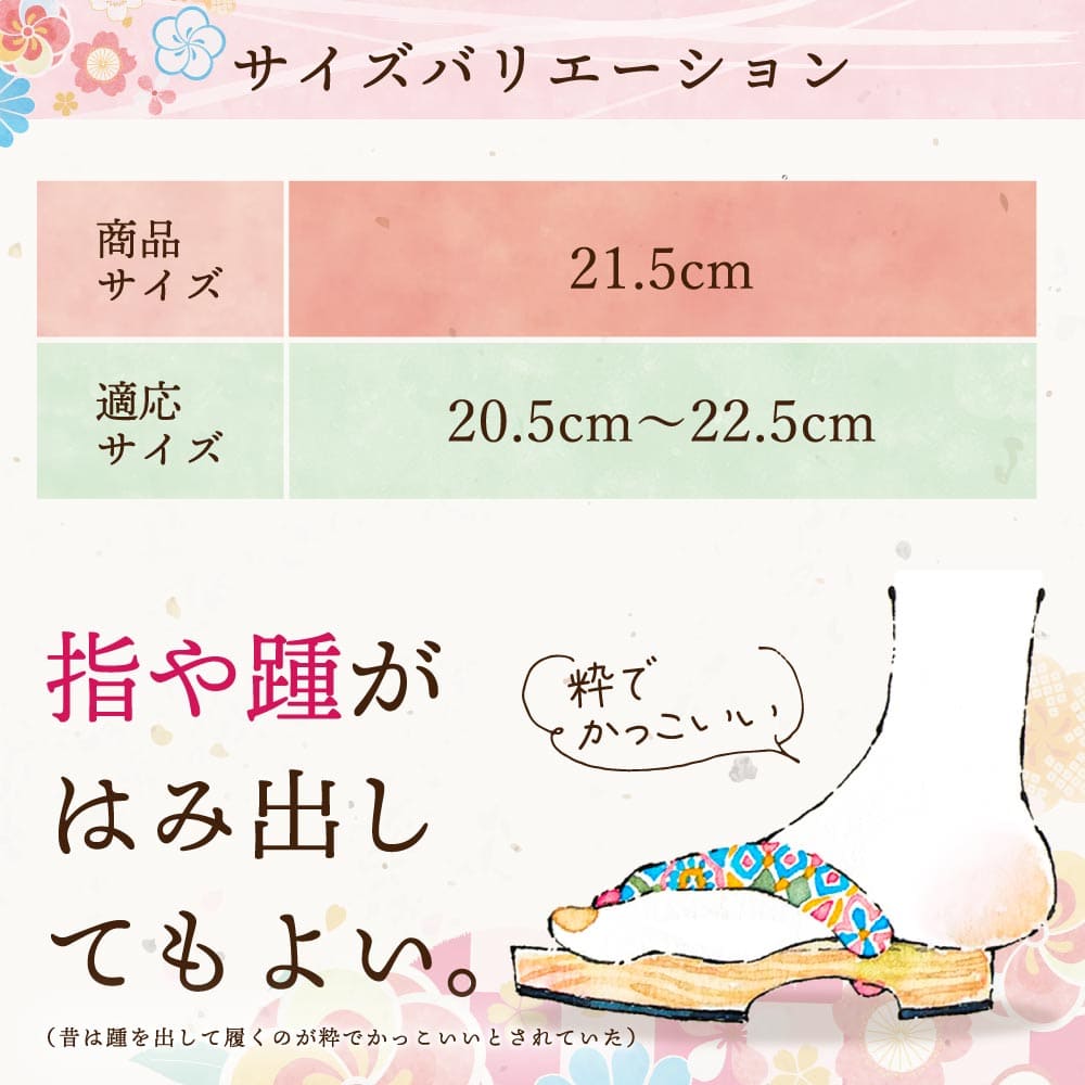 ※自然木を使用している為、写真とは木目や色目が異なる場合がございます。 ※大きな生地を細く切って花緒に使用していますので、それぞれ柄の出具合が違っており写真とは見た目が異なることがあります。 ※デジタルカメラ、モニターの性能上、画像の明るさや色合いなどが、多少実物と異なる場合がございますが、ご了承下さい。 | |