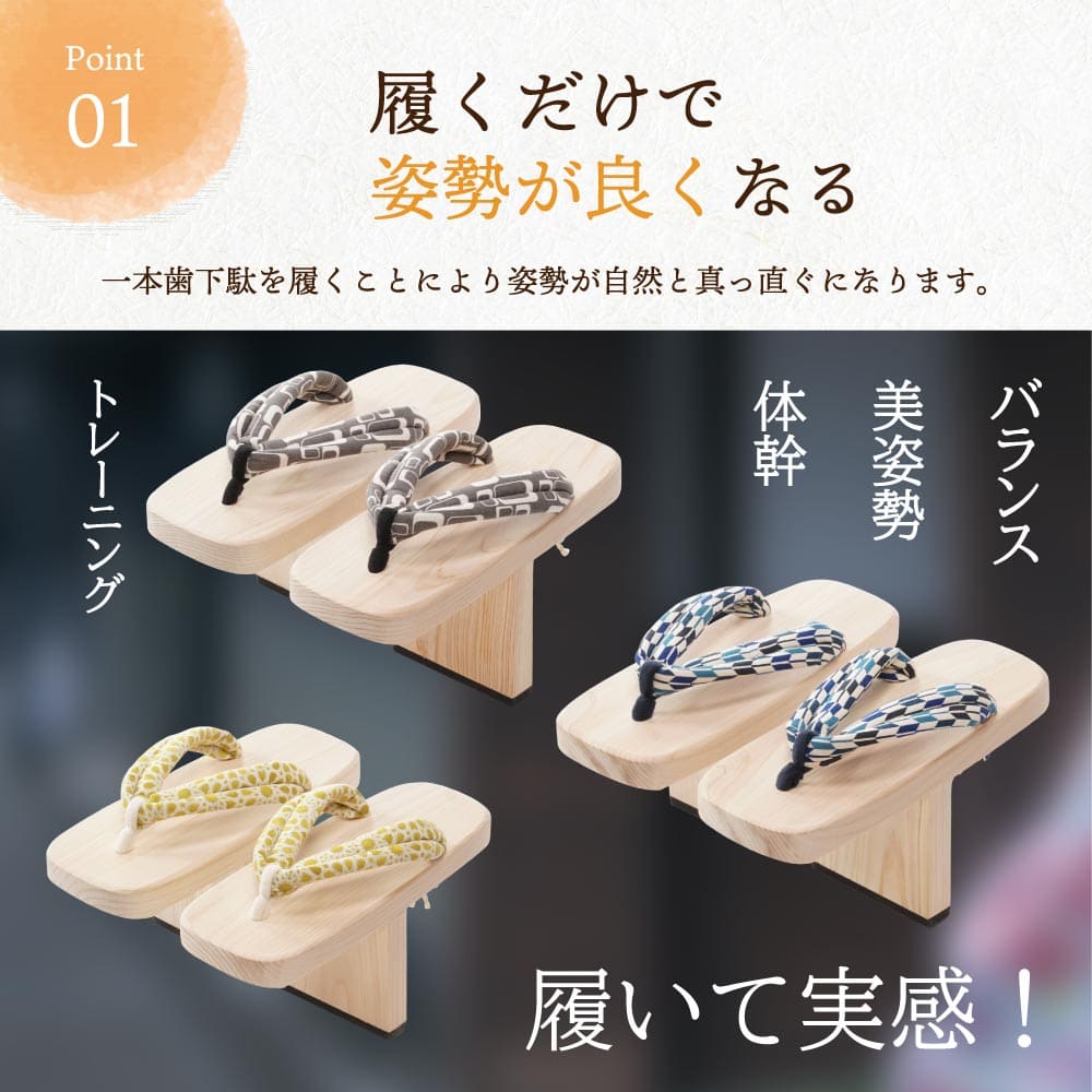 慣れてくると、花緒を足の親指と人差し指でしっかりと挟んで歩けるようになることで足趾(そくし)のトレーニングになるとともに、靴履きと比較して筋肉をよく使うことで、体幹が安定してくることを感じられたり美しい姿勢・立ち姿も期待できます。