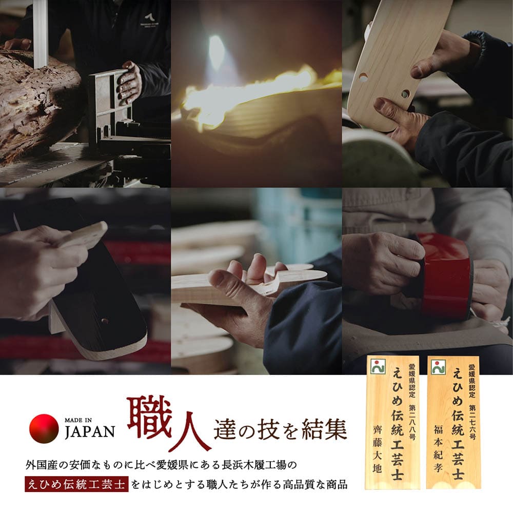 一本歯下駄は、、すばらしい技術を保持するえひめ伝統工芸士を始めとする職人たちが、原木から製品まで自社で一貫生産している愛媛県大洲市にある1949年創業の老舗木履メーカー有限会社長浜木履工場にて製造されています。