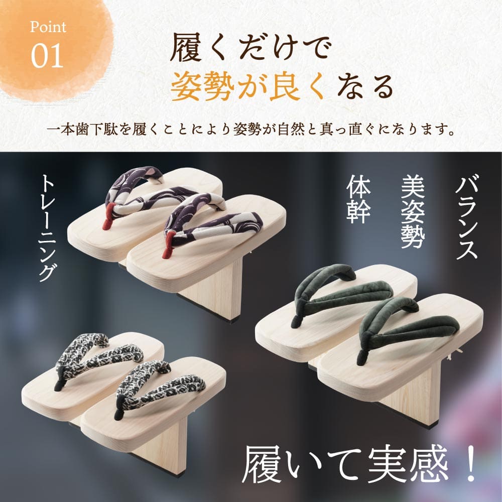 一本歯下駄を履いているうちに段々と慣れてくることで、より長い時間履いて歩けるようになったり、最初は出来なかったその場での直立ができるようになったりと、時間とともに自分の「成長」を感じながら楽しんでいただけます。