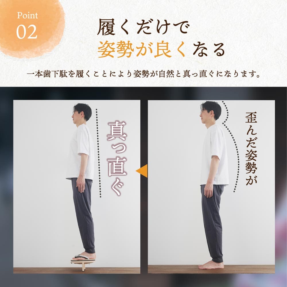 一本歯の場合は立ったままの状態でバランスがとりづらく、まっすぐ立てるように体が自然と調整しようとすることでバランス感覚の向上や体幹トレーニングなどに役立つと言われています。