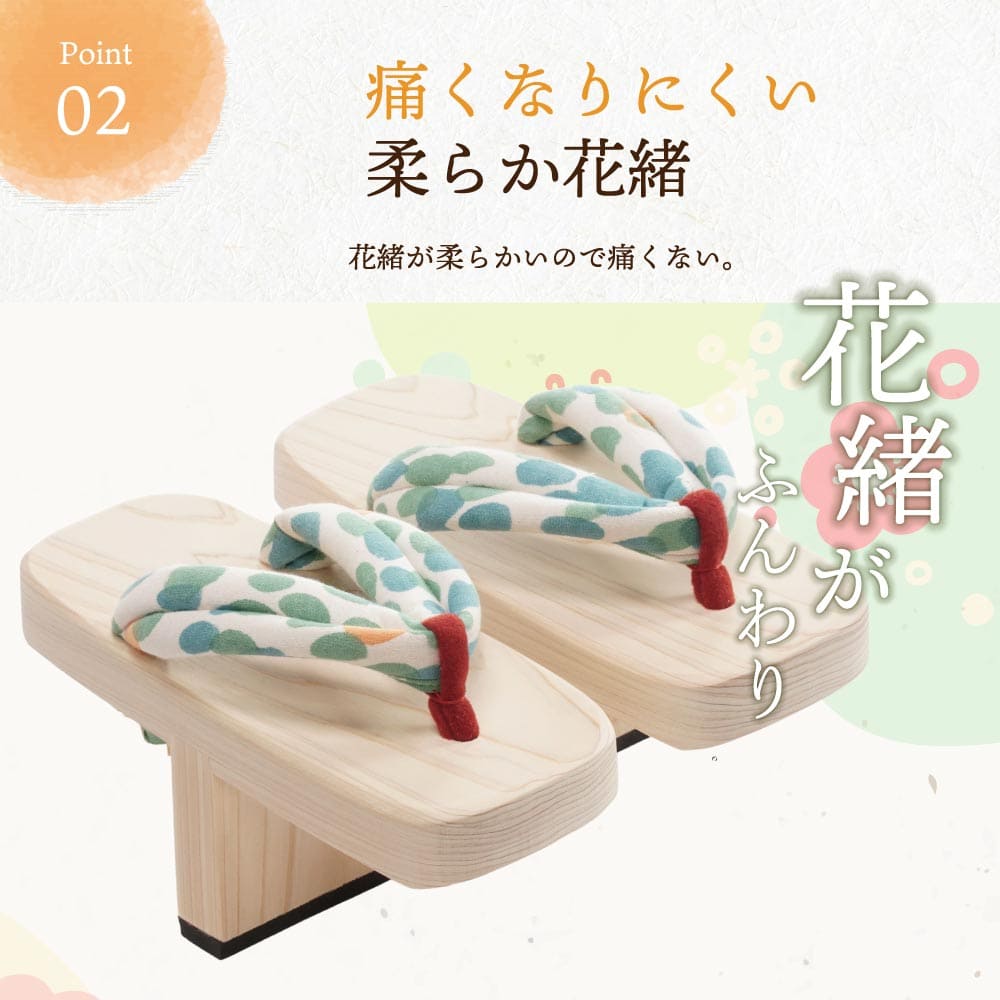| 使用上の注意 | 1.下駄は傷つきやすいので取り扱いは十分ご注意下さい。 2.濡れた場所ではスリップに注意してくだい。 3.水に濡れた場合、花緒が色落ちする恐れがあります。 4.白木下駄は足の跡が付くことがございます。 5.自然木の為、ヤニ(樹液)が出る場合がございます。 6.バランスを崩しケガをする恐れがあります。 |