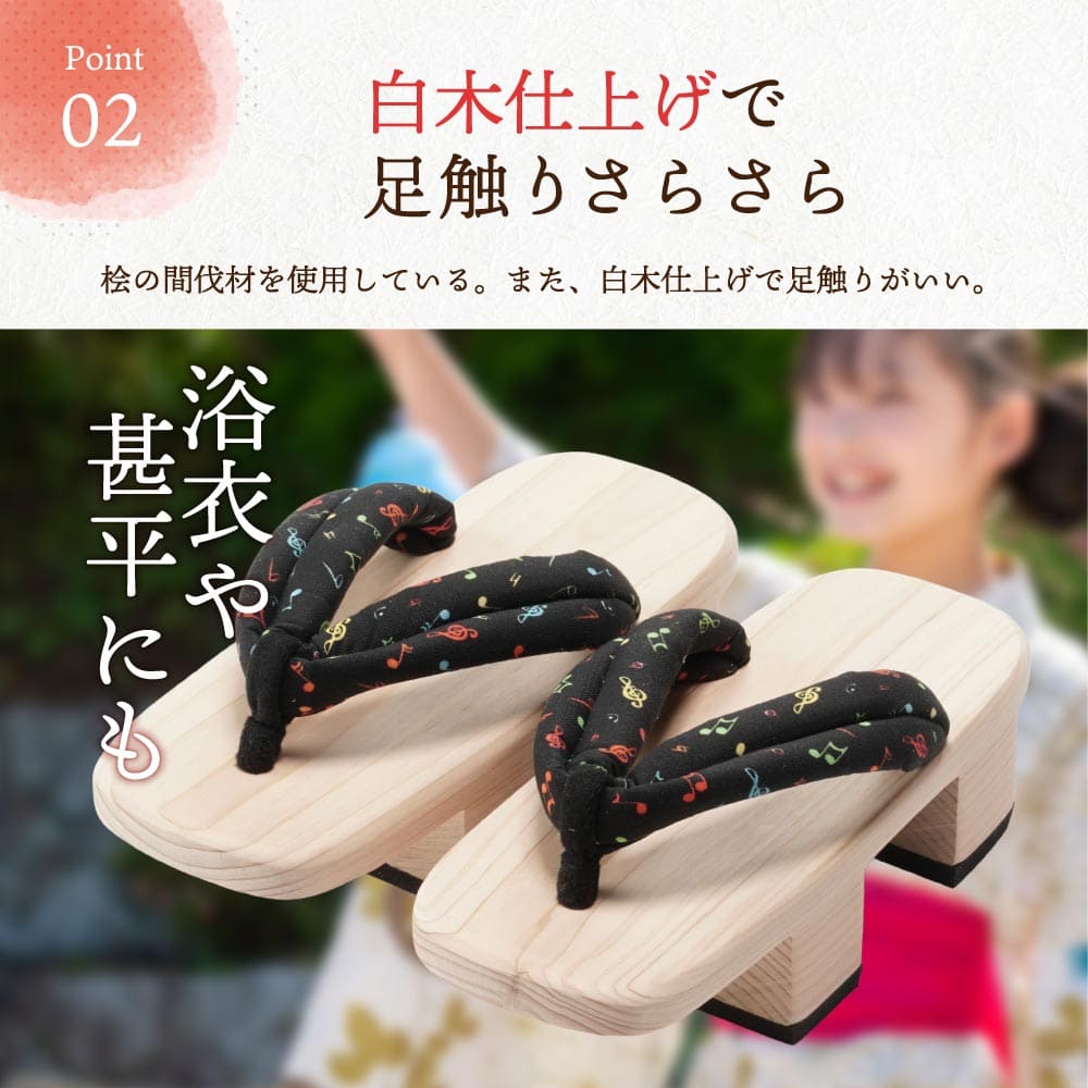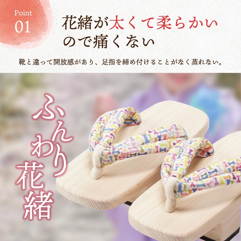 | 使用上の注意 | 1.下駄は傷つきやすいので取り扱いは十分ご注意下さい。 2.濡れた場所ではスリップに注意してくだい。 3.水に濡れた場合、花緒が色落ちする恐れがあります。 4.白木下駄は足の跡が付くことがございます。 5.自然木の為、ヤニ(樹液)が出る場合がございます。 |