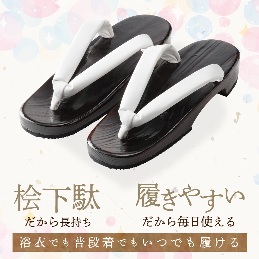 | 使用上の注意 | 1.下駄は傷つきやすいので取り扱いは十分ご注意下さい。 2.濡れた場所ではスリップに注意してくだい。 3.水に濡れた場合、花緒が色落ちする恐れがあります。 4.自然木の為、ヤニ(樹液)が出る場合がございます。 |